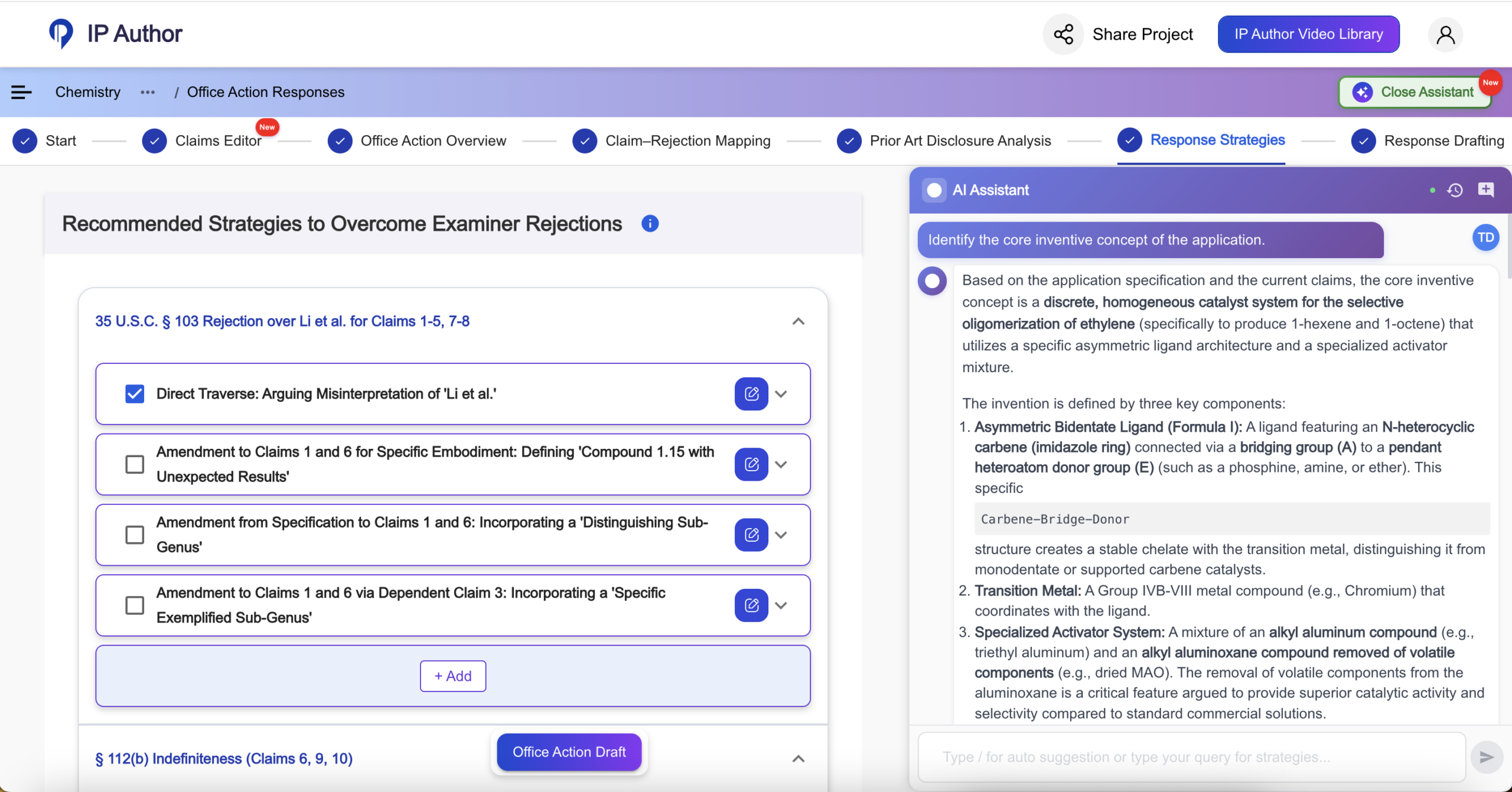 The system also incorporates the full prosecution history of the matter. Every prior rejection and every prior applicant response is in scope when strategy recommendations are generated. This is not a chatbot answering questions in isolation. It is an agentic assistant with continuity across the full life of the case.