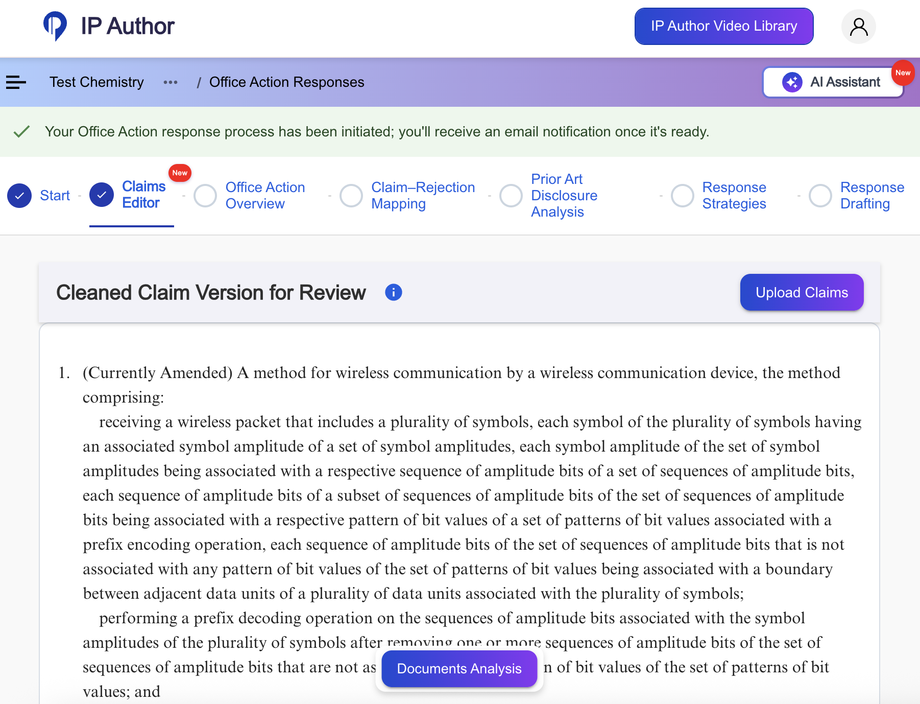 IP Author now requires attorneys to confirm the current claim set before any drafting begins. The Claim Editor puts the claims in front of you for review. You lock them. That confirmed version becomes the foundation for every argument, every amendment, and every strategic decision that follows. Nothing downstream gets built on an assumption.